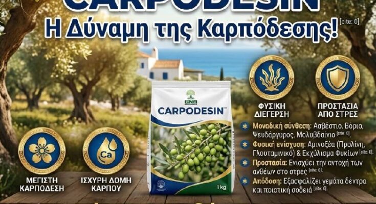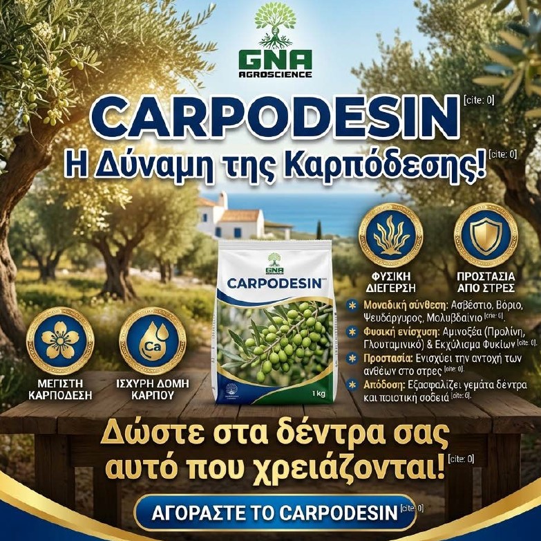 Το CARPODESIN® είναι το νέο εξειδικευμένο πολυσυστατικό βιοδιεγερτικό σκεύασμα της GNA AGROSCIENCE, σχεδιασμένο ειδικά για την ενίσχυση της καρπόδεσης και τη βελτίωση της ποιότητας παραγωγής. Πρόκειται για ένα προηγμένο, στερεό προανθικό βιοδιεγέρτη, ειδικά σχεδιασμένο για τη μεγιστοποίηση της καρπόδεσης. Συνδυάζει στοχευμένα L-αμινοξέα (Προλίνη, Γλουταμινικό), εκχύλισμα φυκών (Ascophyllum nodosum) και ιχνοστοιχεία (Βόριο, Ψευδάργυρος, Μολυβδαίνιο), ενισχύοντας τη ζωτικότητα της γύρης και την επιτυχή γονιμοποίηση. Παράλληλα, χάρη σε ισχυρούς φυσικούς ωσμορρυθμιστικούς παράγοντες, θωρακίζει τα άνθη απέναντι στο αβιοτικό στρες (ακραίες θερμοκρασίες, υδατική καταπόνηση), ενώ το οργανικό Ασβέστιο (12%) ενισχύει τα κυτταρικά τοιχώματα, αποτρέποντας δραστικά την ανθόρροια. Εξασφαλίζει δυνατούς καρπούς και υψηλές αποδόσεις σε όλες τις καλλιέργειες.